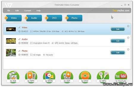 Универсальное приложение, которое предлагает вниманию пользователей инструменты для быстрого конвертирования видеоматериалов в распространенные форматы, их последующего редактирования и записи на оптические носители. С помощью Freemake Video Converter энтузиасты также смогут выполнять некоторые другие действия, например, подготавливать материалы к просмотру на специфических мобильных устройствах, создавать качественные слайд-шоу и извлекать звуковое сопровождение из понравившихся фильмов.