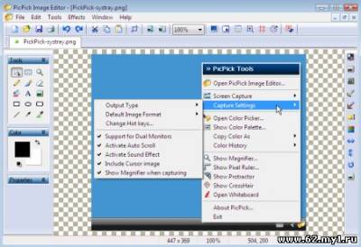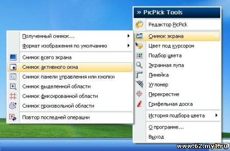 Приложение, объединяющее в себе возможности простого графического редактора и утилиты для захвата изображений с экрана компьютера. PicPick обладает простым и удобным интерфейсом, не требует установки. Среди особых возможностей стоит выделить возможность захвата целого рабочего экрана (в том числе, и на мультимониторных системах), захват только активного окна, отдельной области, целых веб-страниц (с автоматической прокруткой) или же областей с произвольными границами. Графический редактор похож на Microsoft Paint, но обладает встроенными фильтрами и эффектами.