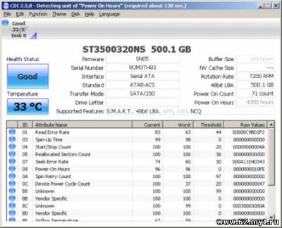 Отслеживает состояние жестких дисков, поддерживающих технологию S.M.A.R.T. Производит мониторинг и дает общую оценку "здоровья" вашего диска. CrystalDiskInfo отображает детальную информацию о жестких дисках, установленных в компьютере (прошивка, серийный номер, стандарт, интерфейс, общее время работы и др.), а также выводит параметры атрибутов системы самодиагностики S.M.A.R.T. (ошибки чтения, производительность, запуски/остановки шпинделя, время поиска дорожки, количество циклов включения-выключения, ошибки секторов и многое другое).