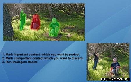 Программа предназначена для масштабирования изображений без изменения важного визуального контента, такого как люди, здания, животные и т.д. При обычном масштабировании изменения влияют на все пиксели равномерно, а с помощью iResizer вы сможете отметить важные элементы изображения, которые вы хотите оставить в оригинальном виде. Просто выделите ту часть изображения, которую вы хотите оставить без изменений, нажмите кнопку Resize (Обработать) и введите новый размер. iResizer является удобным способом изменения размера изображения равномерно при сохранении ключевых особенностей картины. iResizer избегает искажения важных частей изображения. Он также может использоваться для удаления части изображения соответствующим образом.