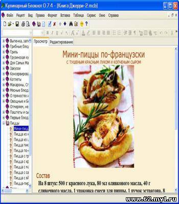 Кулинарный Блокнот - предназначена для записи кулинарных рецептов. В архиве находится уже готовая база (свыше 2500) рецептов, разбитая по разделам (большинство рецептов снабжены цв. иллюстрациями).