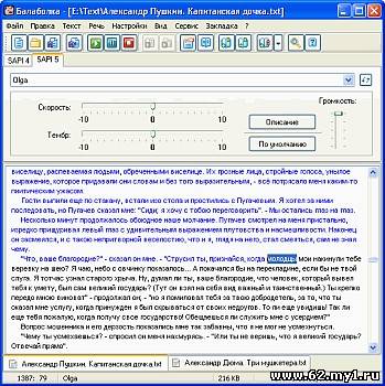 Программа "Балаболка" предназначена для чтения вслух текстовых файлов. Для воспроизведения звуков человеческого голоса могут использоваться любые речевые синтезаторы, установленные на компьютере. Воспроизведение речи можно контролировать при помощи стандартных кнопок, подобных тем, что присутствуют в любой мультимедийной программе ("воспроизвести/приостановить/остановить"). Программа умеет читать вслух содержимое буфера обмена, показывать текст, содержащийся в DOC, EPUB, FB2, HTML, ODT, PDF и RTF файлах.