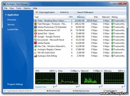 Покажет сколько памяти, процессора, диска и интернет трафика используется каждым процессом на компьютере. Это поможет Вам найти и уничтожить "прожорливые" процессы и троянцев, прячущихся в обычные файлы вроде explorer.exe. Программа также покажет запущенные на Вашем компьютере сервисы. Также уникальной является способность программы отображать список заблокированных файлов, и какие программы открыли данные файлы. Это незаменимо для тех, кто хочет удалить или скопировать заблокированные файлы, а также полезно, если Вы не знаете, почему данный файл был заблокирован.