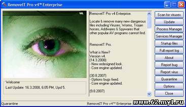 Выявляет и удаляет из системы вирусы, причем, по уверениям разработчика, даже те вирусы, которые не обнаруживают популярные антивирусные программы. Кроме этого, RemoveIT Pro выдает сведения обо всех активных процессах (с указанием полного пути) и список всех модулей и файлов, исполняемых при загрузке Windows. В RemoveIT Pro v4 SE имеется специальная кнопка, предназначенная для обновления антивирусных баз через Интернет. Кроме того, утилита позволяет отображать список запущенных процессов и список автоматически запускаемых файлов. В Менеджере процессов можно завершить работу запущенных программ и удалить связанные файлы (иногда это делать просто необходимо при удалении какого-либо вируса).