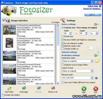 Программа предназначена для пакетной обработки изображений. При помощи Fotosizer можно легко изменять размеры рисунков. Программа предельно проста в обращении. Fotosizer позволяет обрабатывать одновременно большое количество рисунков, к примеру, целую папку. Работает с наиболее распространенными графическими форматами.