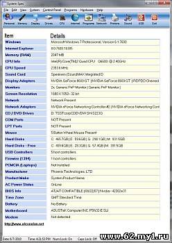 Программа, показывающая всевозможную информацию о компьютере: IP и MAC адреса, версия установленной операционной системы и браузера Internet Explorer, память, CPU, звуковая карта, видео, сетевые адаптеры, временная зона, CD/DVD-привод, принтеры, порты, жесткие диски, изготовитель и т.д. Поддерживается вывод отчета на печать или в текстовый файл. Может работать из командной строки.