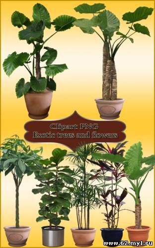 Клипарт PNG - Экзотические деревья и цветы 2 Замечательный набор комнатных деревьев и цветов в горшках для фотомонтажа. Все элементы на прозрачном фоне и в большом разрешении. PNG + PSD | 2600 x 3700 px | 12 элементов | 110 мб