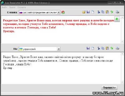 Ace Translator – программа для перевода любых текстов с иностранных языков на русский и обратно. Новый интерфейс в стиле Ace Translator. Улучшенный механизм перевода гарантирует более высокое качество перевода благодаря обновленным лингвистическим алгоритмам хотя какие они при одном метре данных. Особенности: - Быстрый и качественный перевод - Удобный многоязычный интерфейс - Малый и удобный размер программы []  [/] Размер: 2,13 Мб Информация на восстановление: +1% Язык Интерфейса: Multilanguage(Русский) Лекарство: в архиве Платформа: Windows 2000/2003/XP/Vista/ 7 Cкачать Ace Translator 9.4.2.0 :