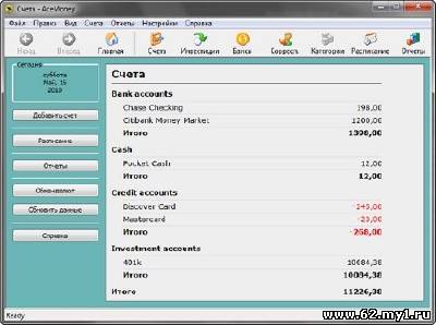 Даже если вы далеки от вопросов бухгалтерии, это не значит, что вы не заинтересованы в учете и эффективном управлении своими личными денежными средствами. Программа AceMoney ориентирована как раз на тех пользователей, кто хочет планировать семейный бюджет, учитывать доходы и расходы, но не имеет времени и желания осваивать сложные бухгалтерские пакеты, написанные для профессионалов. Установив на своем компьютере AceMoney, вы получаете возможность управления счетами различных типов: кассой, сберегательными счетами, долгами и кредитами. Доходы и расходы учитываются в нескольких валютах, при этом программа способна автоматически загрузить курсы обмена валют из Интернета. Благодаря тому, что можно создавать новые типы счетов, вы получаете замечательную возможность сконфигурировать программу так, чтобы она максимально удовлетворяла ваши потребности учета.