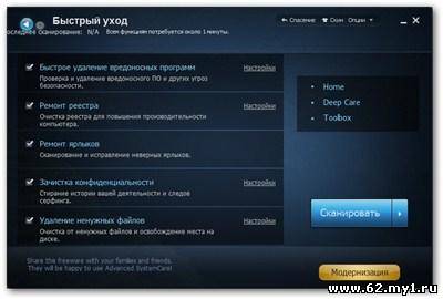 Advanced SystemCare Pro - эта программа предназначена для глубокого анализа системы, производит оптимизацию системной конфигурации, а так же изменяет на оптимальные настройки безопасности, удаляет из системы Spyware и Adware, исправляет ошибки в системном реестре, удаляет временные файлы, оптимизирует параметры интернет-соединения, позволяет управлять автозагружаемыми приложениями, производит дефрагментацию файловой системы и т.д. и т.п.