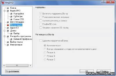 Опции Blu-Ray • Все стандартные опции присутствующие в AnyDVD. • Удаление защиты (AACS) в Blu-ray дисках. • Снятие защиты от копирования BD+ в Blu-ray дисках. • Удаление всех региональных привязок из BD дисков. • Просмотр фильмов с любым цифровым подключением, без HDCP-совместимой графической карты и без HDCP-совместимого дисплея. • Отлично подходит для просмотра высококачественных фильмов на PC. • Использует Universal Disk Format (UDF) формат чтения, нет необходимости в дополнительной установке каких-либо файловых систем. Диски не читаемые в Windows могут быть скопированы при помощи AnyDVD.
