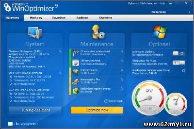 Ashampoo WinOptimizer - новая 9-я линейка пакета программ, позволяющего оптимизировать операционную систему за счет ее настройки и очистки. Включает в себя утилиты для очистки жесткого диска и системного реестра, модуль для обеспечения защиты личной информации путем поиска и удаления файлов и данных, оставшихся после интернет-cepфингa, утилиту для оптимизации интернет-соединения, модуль для настройки программ, автозагружаемых одновременно с запуском системы, а также модули для поиска и удаления ненужных файлов DLL, для безвозвратного удаления данных и для шифрования файлов. Кроме этого, программа позволяет переназначать ассоциации файлов, шифровать и расшифровывать файлы, а также безвозвратно их удалять. Наконец, возможна настройка параметров системы и ее оптимизация за один клик. В шестой версии программы появилось немало новых возможностей, новые модули, включая новый антишпионский модуль и менеджер контекстного меню Windows, а также множество улучшений и исправлений. Особенности: Оптимизация и очистка ваших жестких дисков Очистка от временных интернет файлов Очистка системного реестра от мусора и неправильных записей Одно-кликовая оптимизация системы Простая и эффективная дефрагментация жестких дисков Управление автозапуском программ Управление запущенными процессами Оптимизация и увеличение скорости вашего интернет соединения Полное удаление файлов без возможности их восстановления Восстановление удаленных файлов Настройка параметров ОС Windows Изменение внешнего вида Windows с помощью Визуального Стилиста Сохранение и восстановление расположения иконок на вашем рабочем столе Просмотр дисковой и системной информации Прямой доступ ко всем функциям ОС Windows Разделение и соединение больших по размеру файлов Приятный пользовательский интерфейс