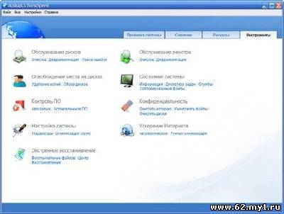 Возможности программы: » Очистка диска компьютера от ненужных файлов » Очистка системного реестра от ошибок и ненужных записей » Поиск и удаление файлов-дубликатов » Дефрагментация жесткого диска компьютера » Дефрагментация системного реестра для увеличения производительности » Ускорение и оптимизация интернет-соединения » Дефрагментация и очистка оперативной памяти компьютера » Очистка истории браузеров, программ и удаление следов » Блокировка возможных путей вторжения в компьютер извне » Безопасное удаление файлов и папок с компьютера » Полная очистка дисков от ранее удаленных файлов » Настройка операционной системы с помощью скрытых возможностей » Настройка системных служб вашей системы » Управление установленными программами и их удаление » Управление списком программ в автозагрузке » Получение детальной информации о вашей системе » Просмотр запущенных процессов с детальной информацией о каждом процессе » Быстрый доступ к встроенным инструментам Windows » Многоязычный интерфейс с поддержкой русского языка