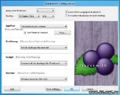 Blacksmith – многофункциональное приложение для создания виртуальных рабочих столов, переключения между ними в стиле Android или Mac OS X, быстрого запуска программ, переключения между запущенными приложениями и управления окнами. В первую очередь эта программа создана для пользователей, работающих с большим количеством приложений одновременно, которым не чужды идеи кастомайзинга интерфейса операционной системы.