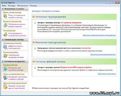 Reg Organizer - мощный многофункциональный менеджер реестра и конфигурационных файлов. С его помощью можно просматривать и редактировать реестр, осуществлять предварительный просмотр импортируемых reg-файлов, чистить набирающиеся со временем бесполезные ключи, деинсталлировать ненужные программы, настраивать автозагрузку системы. Reg Organizer с легкостью исправит неверные ярлыки, очистит жесткий диск от накопившегося мусора, открывает доступ к некоторым недокументированным возможностям Windows. Усовершенствован алгоритм поиска по реестру. Теперь режим поиска работает значительно быстрее, чем в предыдущей версии. Повышена скорость работы программы при операциях, связанных с изменением данных в реестре (создание, удаление или модификация ключей и параметров). Улучшения в функции Автоматической чистки реестра. Особенности: • Редактор реестра • Функция чистки реестра для поиска ненужных записей в реестре, а также для поиска и исправления проблем в реестре. • Функция поиска в реестре • Дефрагментация и сжатие реестра. • Возможность изменения многих "тонких настроек" Windows (tweaks). В частности, Вы можете ускорить работу Вашей системы, приказав системе использовать кэш-память большего объема, или заставив систему выгружать неиспользуемые библиотеки из памяти и т.д. • Возможность получать информацию о любом ключе реестра и следить за изменениями в нем. • Предварительный просмотр файлов реестра (*.reg) перед импортом их содержимого, в том числе и непосредственно из Проводника. • Просмотр и редактирование автоматически запускаемых программ. • Режим поиска и замены в реестре. • Встроенная функция деинсталляции любых приложений. Она может сделать "снимок" системы до и после установки приложения, после чего можно полностью "откатить" внесенные в систему изменения, как будто приложение не было установлено. • Инструмент "Чистка дисков" позволяет производить автоматическую чистку жестких дисков вашего компьютера от различных ненужных файлов, а также выполнять поиск и исправление неверных ярлыков. • Управление конфигурационными файлами.