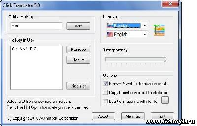 Click Translator - обеспечит мгновенный перевод выделенного текста. Переводите текст при помощи мыши и нажатия горячей клавиши! Все, что Вам нужно сделать - это выделить текст и нажатием горячей клавиши получить перевод во всплывающем сообщении. Вы можете настроить горячие клавиши, сохранить перевод в текстовый файл и скопировать его в буфер обмена. Особенности: Translate text from anywhere on screen. Translate is simplified as a single mouse select and a key press. Define your favorite hot keys to trigger the translation. Translate between any two languages among English, French, German, Spanish, Italian, Dutch, Portuguese (Brazil), Greek, Japanese, Korean, Russian, and Chinese. Works with both Simplified Chinese and Traditional Chinese. Swap source & target language with a single mouse click. Copy translations to clipboard. Log all translations in a specified file. Freeze current window and wait for translation result. Transparent Window and Minimize to Systray (system tray). Switch between normal GUI and simplified GUI.