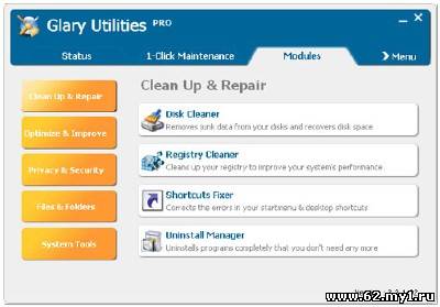 Glary Utilities Pro это мощное приложение все-в-одном, которое поможет вам настроить компьютер, исправить ошибки в работе и заставить его работать быстрее. Программа оптимизирует работу компьютера, решает проблемы, защищает вашу безопасность, а также настроит вашу систему так, чтобы она полностью отвечала вашим требованиям. Особенности: Работает в фоновом режиме; Оптимизирует, подчищает и увеличиваете скорость работы Windows; Защищает вашу конфиденциальность и собственность; Блокирует вирусы, трояны и т.д.; Исправляет ошибки в работе программ; Простой и удобный в использовании интерфейс; И многие другие возможности!' []  [/] Размер: 6,37 Мб Информация на восстановление: +1% Язык Интерфейса: Multilanguage(Русский) Лекарство: в архиве Платформа: Windows 2000/2003/XP/Vista/ 7 Cкачать Glary Utilities Pro 2.41.0.1358: