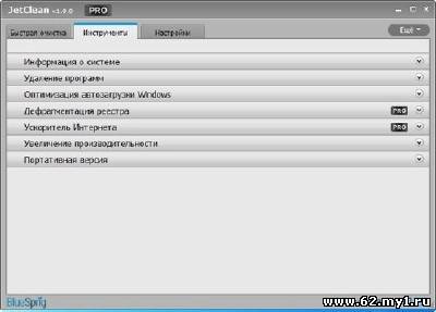 JetClean предлагает решение в 1-клик, чтобы очистить ваш реестр, файлы Windows, мусор и осиротелые ярлыки. JetClean также помогает защитить вашу секретность, сохраняя установленные браузеры, программы и приложения,такие как Windows Media Player, Google Toolbar, Microsoft Office, Adobe Acrobat, WinRAR, WinZip и т.д. чистыми . JetClean выполнит удаление нежелательных мусорных файлов, которые могут существовать в корзине, недавних документах, временные файлы, файлы журналов, буфер обмена, DNS Cache, сообщения об ошибках, дампы памяти, Jump Lists. Его Registry Cleaner очищает реестр и удаляет все неиспользуемые и старые записи в реестре, включая расширения файлов, элементы управления ActiveX, деинсталляторы, общие DLL, шрифты, файлы справок ,пути приложений, иконки, неверные ярлыки и т.д. Модуль очистки оперативной памяти снимет претензии к оптимизации использования памяти, чтобы увеличить объем доступной физической памяти. JetClean также предлагает портативный вариант, который позволяет создать единый JetClean исполняемый файл, который вы можете скопировать на флэшку и решить вопрос о лицензии на ходу. Инструмент также включает в себя Uninstaller, Startup Optimizer, Performance Booster. Инструмент Performance Booster также доступен для бесплатной загрузки как самостоятельный инструмент под названием JetBoost . Особенности: JetClean очищает от ненужных файлов, вредоносных программ, ненужные записи в реестре и улучшает производительность компьютера одним простым щелчком мыши. Очищает реестр и принимает все неиспользуемых и старых записей в реестре, включая расширения файлов, элементов управления ActiveX, деинсталляторы, Общие DLL, шрифты, файлы справки Пути приложений, иконки, неверных ярлыков и многое другое .... Найти и удалить все ненужные файлы, которые могут существовать в корзине, недавние документы, временные файлы, файлы журналов, буфер обмена, DNS Cache, сообщения об ошибках, дампы памяти, Jump Lists. Удаление временных файлов и списков файлов (MRUs) из многих приложений, включая Windows Media Player, эМюль, Google Toolbar, Microsoft Office, Adobe Acrobat, WinRAR, WinAce, WinZip и многое другое ... Проверка на неверных ярлыков, удаление или ремонт их. Оптимизация использования памяти, чтобы увеличить объем доступной физической памяти. Позволяет изменить порядок приложений, запуск вместе с Windows, при запуске. Завершает работу приложения, которые могут замедлить работу системы. JetClean помогает ускорить Интернет-соединение Ремонт структурных ошибок и ускоряет доступ к Вашему ПК в реестре. Удалить выбранную программу Легко создавать портативную версию для вашего удобства. Предложения основной чистыми и оптимизации функций. 100% Чистый и 100% безопасно Без какого-либо вредоносного ПО, шпионских программ и вирусов. JetClean является 100% чистый и безопасный инструмент для вас