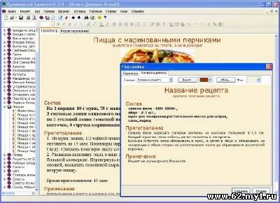 Основные особенности : • возможность создания структуры разделов любой сложности • полнофункциональный текстовый редактор рецептов с возможностью -использования различных шрифтов, цветов и форматирования параграфа • возможность вставки изображений в любую часть рецепта • поиск рецептов по заданным параметрам • печать рецептов. • программа "Кулинарный Блокнот" абсолютно БЕСПЛАТНА.
