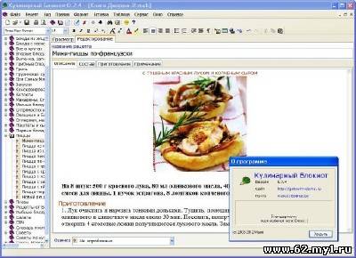 Кулинарный Блокнот - предназначена для записи кулинарных рецептов. В архиве находится уже готовая база (свыше 2500) рецептов, разбитая по разделам (большинство рецептов снабжены цв. иллюстрациями).