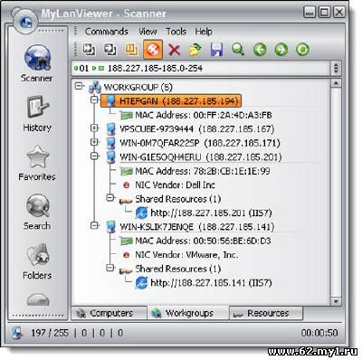 MyLanViewer - простой и удобный сканер-вьювер вашей домашней сети. Сканирует и отображает наличие компьютеров в сети, их имена, IP и MAC адреса, расшаренные ресурсы и другие технические детали для каждого отдельно взятого компьютера. Так же можно не только просматривать, но и обращаться к расшаренными папками, закрывать сессии и доступ к этим папкам. Прост в установке и использовании, - имеет красивый привлекательный интерфейс.