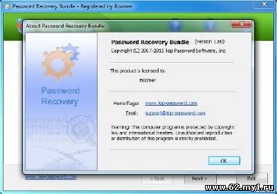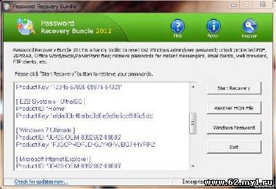 * MSN Password Recovery — Recovers passwords for MSN Messenger, Windows Messenger, Hotmail, MSN Explorer and Windows Live Messenger accounts. * Email Password Recovery — Retrieves passwords to mail accounts created in Outlook 98/2000/XP/2003/2007, Outlook Express, Windows Mail, Windows Live Mail, Eudora, Incredimail, Becky! Internet Mail, Phoenix Mail, Ipswitch IMail Server, Reach-a-Mail, Mozilla Thunderbird, The Bat!, etc. * PST File Password Recovery — Enables you to recover lost or forgotten passwords to personal folders in Microsoft Outlook (.pst files). * Windows Cached Password Recovery — Recovers Windows 7/Vista/2008/2003/XP/2000/NT autologon password (when user is logged on). * Dialup Password Recovery — Helps you to easily recover logins and passwords for RAS, VPN or Dial-up Networking connection. * Google Talk Password Recovery — Recovers login and passwords for your Google Talk, Google Desktop, Gmail Notifier, Picasa and Gmail accounts stored on the local computer. * Miranda Password Recovery — Recovers AIM, ICQ, MSN, Yahoo! Messenger, Jabber, IRC passwords stored by Miranda instant messenger. * Product Key Finder — Easily finds lost product key (CD Key) for Windows, Microsoft Office, SQL Server, Exchange Server and many other products, even if you can't boot into Windows. * AIM Password Recovery — Recovers lost or forgotten passwords for AOL Instant Messenger, AIM Pro, AIM 6.x and 7.x. * IE Password Recovery — Allows you to recover passwords to Web sites saved in Microsoft Internet Explorer, as well as AutoComplete passwords. Remove Content Advisor passwords. * Firefox Password Recovery — Displays logins and passwords for protected sites stored by Firefox and Mozilla browsers, even from crashed computer. * New! Opera Password Recovery — Recovers website passwords stored by Opera browser, as well as passwords to all mail accounts configured in Opera Mail. * Chrome Password Recovery — Allows you to view the usernames and passwords stored by Google Chrome Web browser. * Trillian Password Recovery — Finds all Trillian accounts saved on your local computer. All versions of Trillian are supported: Trillian Basic, Trillian Pro and Trillian Astra. * Paltalk Password Recovery — Recovers AIM, ICQ, MSN, Yahoo! Messenger and ICQ passwords saved by Paltalk instant messenger. * FTP Password Recovery — Decrypts FTP passwords stored by most popular FTP clients: CuteFTP, SmartFTP, FileZilla, FlashFXP, WS_FTP, CoreFTP, FTP Control, FTP Navigator, FTP Commander, FTP Voyager, WebDrive, 32bit FTP, SecureFX, AutoFTP, BulletProof FTP, Far Manager, etc. * Access Password Recovery — Unlocks Microsoft Office Access 95/97/2000/XP database. * Other Password Recovery — Recovers passwords for Ipswitch Instant Messaging, EasyWebCam, Digsby, Total Commander, Camfrog Video Chat, Remote Desktop Connection.