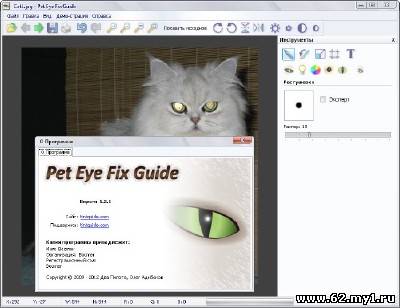 Pet Eye Fix Guide - программа для устранения эффекта засвеченных глаз с фотографий домашних животных и людей. Позволяет восстановить даже полностью испорченные вспышкой глаза. Может справиться с засвеченными глазами любого цвета - красными, желтыми, зелеными, синими и даже полностью белыми. Уберет засветку как в зрачке, так и на всем глазу. Программа реализована как самостоятельное приложение и как плагин к различным графическим редакторам. Особенности: Затенение - устраняет засветку; Блик - оживляет глаза добавлением бликов; Цвет глаз - изменяет цвет радужки; Зрачок - восстанавливает зрачок в полностью засвеченных глазах; Кошачий зрачок - восстанавливает кошачий зрачок в полностью засвеченных глазах; Акцент - придает выразительность глазам, подчеркивает отдельные детали. []  [/] Размер: 2,48/2,91 Мб Информация на восстановление: +1% Язык Интерфейса: Вшито Лекарство: в архиве Платформа: Windows 2000/2003/XP/Vista/ 7 Cкачать Pet Eye Fix Guide 1.2.2 RePack/Portable by Boomer :