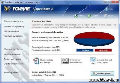 SuperRam - программа для оптимизации и управления компьютерной памятью. Работать с утилитой просто - с ней справится даже человек, никогда раньше не работавший с подобными утилитами. Вам будет достаточно указать объем памяти, какой будет использоваться, и объем, какой следует освободить, впоследствии чего нажать кнопку "ОК". Остальное сделает SuperRam. Эффект, как уверяют создатели программы, будет заметен моментально - выразится это, конечно же, в первую очередь, в быстродействии программ, какие до этого могли отчаянно "тормозить". помимо этого, программа всегда покажет вам график, на котором понятно видно, какой объем памяти используется, а какой - свободен. Особенности: - Оптимизирует память компьютера путем освобождения. - Работает в фоновом режиме, чтобы освободить память для поддержания стабильности системы. - Визуальное представление в системном трее которая отображает сколько памяти компьютера доступно в системе. - Вы сами можете выбрать настройки для своих целей. - Простой и интуитивно понятный пользовательский интерфейс, который выполняет оптимизацию памяти в режиме реального времени.