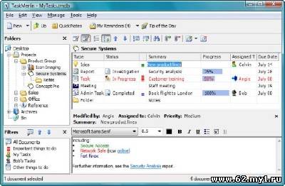 К решениям относится проектный менеджмент, управление заданиями, органайзер персональной информации, список заданий на выполнение, GTD программа, сервисная программа выделения заданий, инструмент управления временем, программа отслеживания неполадок и редактор заметок. Особенности: - Поддержка формата rich text. - Редактирование на месте. - Редактирование множества задач. - Полная настройка программы. - Горячие клавиши. - Поддержка работы с электронной почтой. - Поддержка изображений. - Напоминания. - Мощный поиск. - Фильтрация SQL. - Установка повторяющихся заданий. - Поддержка Microsoft Outlook. - Поддержка переносных устройств хранения. - Многопользовательский доступ к базе данных по сети и Интернету. - Правила доступа пользователей.