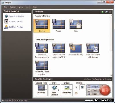 %Oсновное назначение программы - снятие скриншотов с экрана монитора, причем SnagIt умеет делать не только статичные графические "снимки" выбранной области, но и, например, записать в видео то, что происходит на экране, а также захватить картинку из приложений, использующих Direct X, DirectDraw и Direct 3D. Встроенный редактор аннотаций позволяет добавить к скриншоту, описание, что-то подчеркнуть, вставить при необхоимости в нужное место, например, стрелку и т.п. Кроме этого, программа позволяет "выдергивать" текст оттуда, откуда он не перемещается с помощью команд Копировать/Вставить. Из дополнительных функций: поддержка работы со сканерами и цифровыми камерами, а также возможность автоматической отправки сделанных программой скриншотов на веб-сайт. И еще множество других мелочей: управление горячими клавишами, возможность использования преднастроек, выдергивание иконок и другой графики из EXE и DLL, снятие скриншота с веб-страницы, требующей для просмотра прокрутки, и многое другое. Особенности: - Новенький режим захвата экранов, который объединяет парочку возможностей для захвата полностью всего экрана, отдельного окошка или региона всего лишь единственной клавишей. - Улучшился захват с самой прокруткой окошка, захват региона и захват текста. - Была добавлена возможность установки прозрачности в редакторе и при захвате. - Добавлен новенький эффект под названием «Page Curl». - Расширились возможности инструмента под названием «Cuout». - Добавилась возможность поворотов текстовых полей. - Добавилось окошко предварительного просмотра в меню «Сохранить как». Особенности RePack-a: *Инсталлятор вылечен *Интерфейс русский *В интернет не лезет