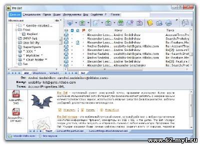 The Bat — мощный и удобный клиент электронной почты для Windows с приятным интерфейсом и множеством уникальных функций, необходимых в работе. Поддерживается любое число почтовых ящиков POP и IMAP, шифрование переписки с помощью PGP , имеется мощная система сортировки почты, диспетчер писем для оповещении о приходе почты на сервер и управления входящей почтой прямо на сервере и множество других, не менее полезных возможностей. Что любопытно, довольно трудно вкратце обьяснить, чем же мышь лучше других почтовых программ (того же Outlook Express), но поверьте на слово, а лучше — убедитесь сами, что на сегодняшний день данная программа является одной из наиболее подходящих почтовых программ для переписки на русском языке. Интерфейс программы переведен на множество языков, включая русский. Особенности: URL менеджер для фонового извлечения изображений в формате HTML Появление URL менеджера для фонового извлечения изображений в формате HTML обусловлено все более частым проникновением вредоносных кодов в компьютеры пользователей через сообщения HTML, содержащие графику. Новый менеджер позволяет блокировать подозрительные и пропускать безопасные изображения, производя извлечение не в зависимости от папки или адресата сообщения, а исходя из опасности хоста или URL поступившего сообщения.