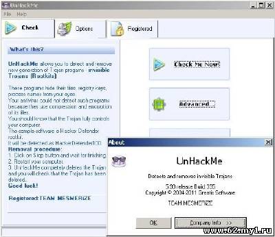 UnHackMe - позволяет обнаруживать и удалять новое поколение троянских программ - невидимых троянов. Их еще называют "rootkits". Rootkit - группа программ, которые хакер использует, чтобы маскировать вторжение и получать доступ уровня администратора к компьютеру или компьютерной сети. Злоумышленник устанавливает rootkit на компьютеры, используя пользовательское действие, эксплуатируя известную уязвимость или взломав пароль. rootkit устанавливает "черный ход" дающий хакеру полный контроль над компьютером. Это позволяет скрывать файлы, ключи реестра, процессы и сетевые подключения. Особенности: • UnHackMe Pro includes special designed tools for detecting deep hidden rootkits. • UnHackMe Pro is unique for each user and it is invisible for a rootkit. • You can open UnHackMe Pro from CD-ROM or from a flash drive. • You can use UnHackMe Pro license for checking and removing rootkits from user computers. • No need to install UnHackMe on a user computer. • No need to purchase additional licenses. • Easy in use. No comments! []  [/] Размер: 15,7 Мб Информация на восстановление: +1% Язык Интерфейса: English Лекарство: в архиве Платформа: Windows 2000/2003/XP/Vista/ 7 Cкачать UnHackMe v5.99 Build 398 :