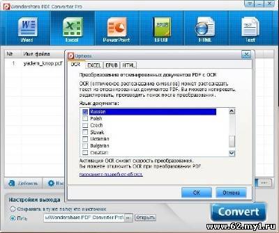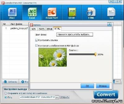 Возможности: • Преобразование PDF файлов в редактируемые Microsoft Word 2002-2010 форматы (. DOC,. DOCX) - Сохранить исходное содержание текста, изображения и формат • Преобразование PDF файлов в редактируемые Microsoft Excel 2003/2007/2010(.xls, .xlsx) • Преобразование PDF файлов в Microsoft PowerPoint 2002-2010 форматы (. PPT,. PPTX) - Сохранить первоначальный формат, макет изображения • Преобразование PDF файлов в формат HTML (. HTML) - Сохранить первоначальный макет, формат, и гиперссылки - Поддержка наиболее популярных браузеров, как IE, Firefox, Safari и Opera. - Возможность определить качество изображения в экспортированных файлах HTML • Преобразование PDF файлов в текстовый формат (. TXT) - Извлечь все текстовое содержание из файлов PDF • Преобразование PDF файлов в формат EPUB • Стандартная версия также поддерживает конвертирование PDF в изображения (. PNG,. JPG,. GIF,. BMP,. TIFF) - Точное сохранение первоначального текста, изображений, графики, гиперссылок. - Поддержка настройки размера шрифта, цвет фона и текста.