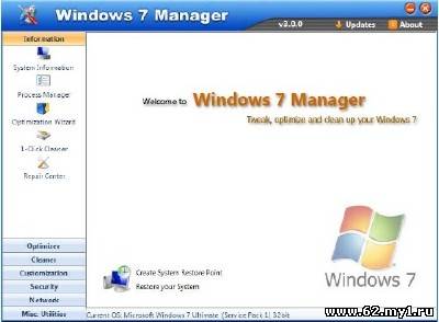 Windows 7 Manager - это системная утилита, которая поможет вам оптимизировать, настроить и выполнить очистку от неиспользуемых файлов и параметров реестра. Программа позволяет существенно увеличить быстродействие системы и ее безопасность. Windows 7 Manager включает более 30 утилит, предназначенных для ускорения работы системы и повышения ее стабильности и безопасности. Программа выдает подробную информацию обо всех компонентах компьютера и о запущенных процессах. Особенности: - Получение детальной информации о вашей системе - Оптимизация скорости загрузки и выключения системы - Настройка аппаратного обеспечения для увеличения скорости и производительности - Оптимизация Планировщика Задач для выключения ненужных системных задач - Поиск и удаление ненужных файлов и различного мусора - Поиск дубликатов файлов - Очистка системного реестра от неправильных и ненужных записей - Дефрагментация системного реестра для увеличения производительности системы - Управление приложениями в автозапуске системы - Настройка загрузочного меню Windows 7 - Редактирование контекстного меню (правая кнопка мыши) - Настройка рабочего стола, меню, панелей инструментов и параметров оповещения - Автоматическое изменение фонового рисунка рабочего стола - Настройка и оптимизация безопасности системы - Оптимизация скорости вашего интернет-соединения - Настройка параметров Interner Explorer - Отображение встроенных утилит Windows []  [/] Размер: 8,93/8,93 Мб Информация на восстановление: +1% Язык Интерфейса: English Лекарство: в архиве Платформа: Windows 2000/2003/XP/Vista/ 7 Cкачать Yamicsoft Windows 7 Manager.v3.0.9.0 :
